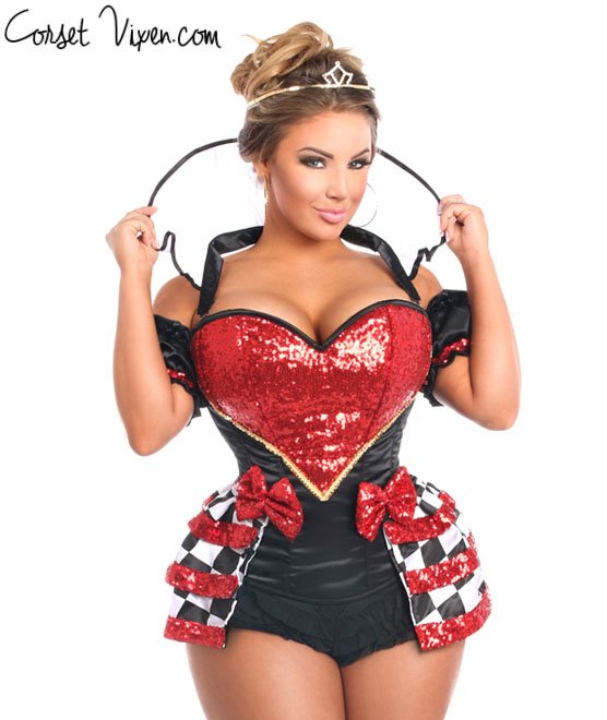 The Queen of Hearts is here at Corset Vixen to enchant your night away. This super sexy stunning Royal Red Queen Corset Costume is a full bust corset made of high quality fabric with a premium side zipper closure. It has eight spiral steel bones with four static steel back bones. The nickel brass grommets with thick cording in the back for cinching to create an hour glass shape. This costume has a removable snap on skirt and removable garters that comes with black mesh ruffle panty, detached sleeves, removable collar and tiara.